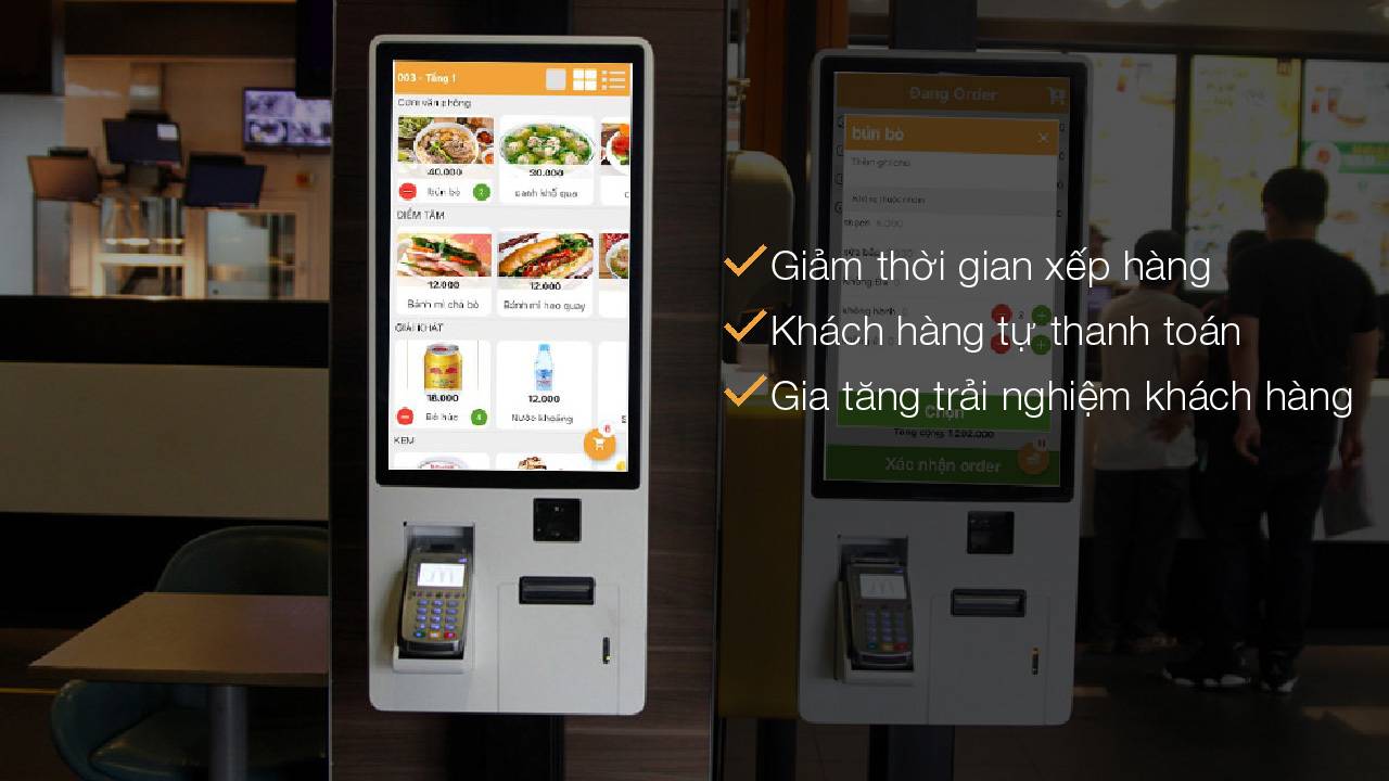 Khách hàng tự Order qua Kiosk: không cần sử dụng menu giấy hay sự giúp đỡ của nhân viên, khách hàng có thể xem menu trực tiếp tại phần mềm tính tiền quán cafe trên Kiosk và tiến hành thao tác chọn món. Sau đó khách hàng có thể đến quầy thu ngân để trả tiền mặt hoặc qua ví điện tử.
